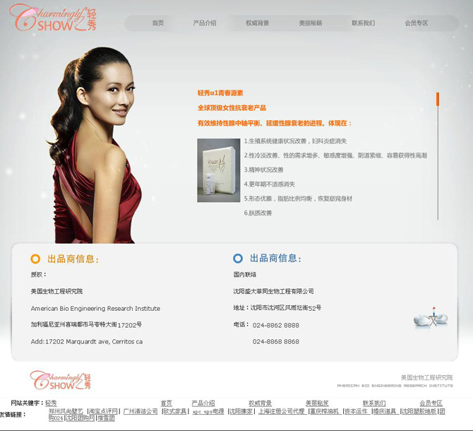 网站描述:现代医学认为:衰老是不可抗拒的自然规律。人的衰老和死亡是绝对的,不可逆转的。但是,人类对对抗衰老这个课题的探索和研究一直没有停止过。无论是从中国古代关于长生不老的传说,或是驻颜有术、返老还童,还是现代社会对于人体健康状态的专注研究,都告诉了我们一个事实:衰老虽然是不可逆转的,但是通过科学的方法,衰老却是可以延缓的。研究表明,女性衰老的主要原因是由卵巢功能早衰导致的。依照人体生理规律,女士30岁应该预防衰老,40岁以上要对抗衰老。只有适时地对卵巢及整个性腺轴进行医学专科调养,老年期的到来,使机体尽量维持平衡态、年轻态,才能延缓容颜及整个机体的衰老。